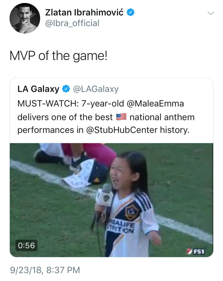 September 24, 2018October 22, 2018Malea Emma National Anthem – LA Galaxy LA Galaxy vs. Seattle Sounders Stubhub Center, Carson 9/23/2018 Share this: Share on X (Opens in new window) X Share on Facebook (Opens in new window) Facebook Like Loading... Related
